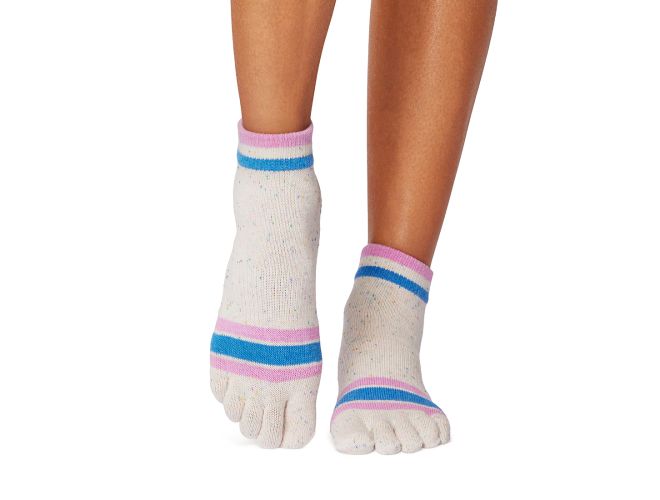 FULL TOE GRIP ANKLE It's like you're bare foot...but even better. For all barefoot activities like Pilates, yoga, dance, barre, and martial arts. Stick To Your Practice™. Patented non-slip grip keeps your feet in place Half toe design lets toes touch surface for a more barefoot experience Five toe design allows toes to move and spread naturally Hygienic alternative to bare feet Arch support band gently lifts and supports Fitted heel keeps sock in place to eliminate bunching and twisting Made with organic cotton Unisex sizing 90% Organic Cotton 8% Spandex, 2% Other Fiber. Printed socks: 58% Polyester, 32% Cotton, 8% Spandex, 2% Other Fiber. Machine washable. Wash inside out in gentle cycle. Line dry or low heat in dryer. No bleach or iron.